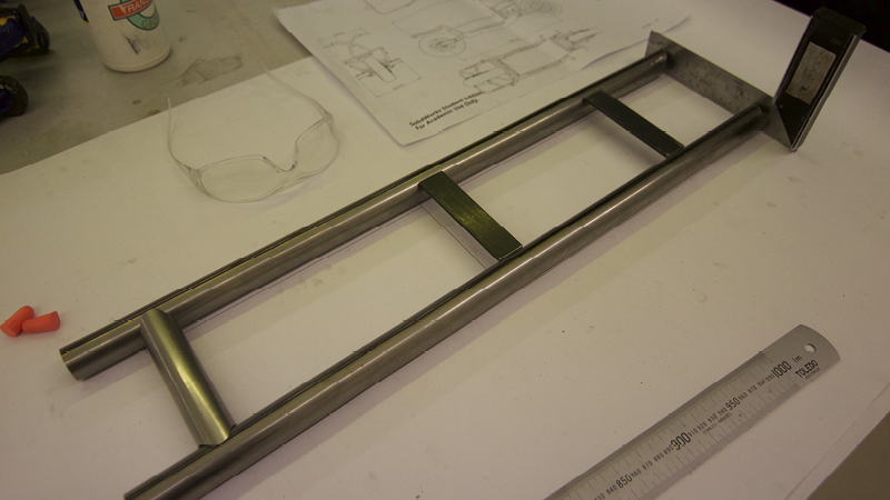 1:1 construction drawings: All the frame components were printed at 1:1 so it was possible to work straight from them. Here the angle cuts have been made into the “front rack supports” and the “front claw arms.”