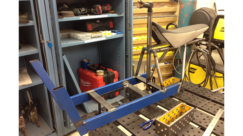 Roni welding: Battery box has been welded to the frame rails and the back end of the frame is beginning to be tacked. Roni (pictured) was one of two welders heavily relied on.