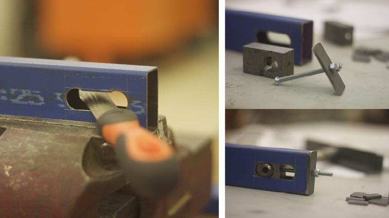 Hand filing the rear axel slots (left). Got a lot of use out of the horizontal bandsaw (right)
