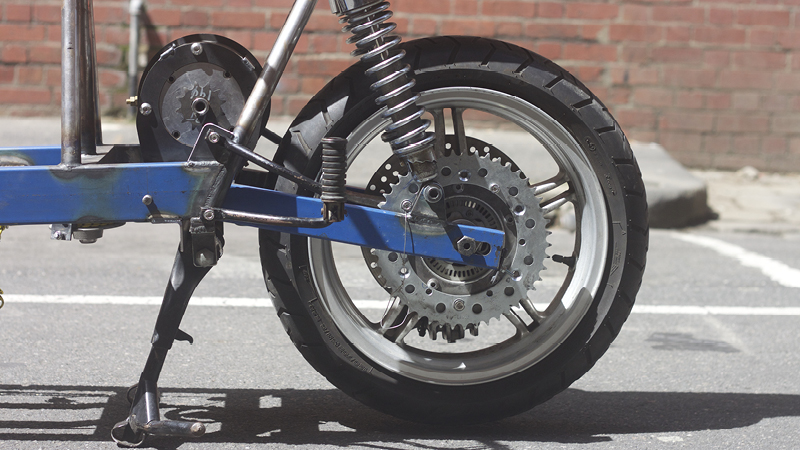 Single shock upfront from the rear of a Sach Madass. The two rear shocks are stock from an SR400 (Craig’s bike of choice).