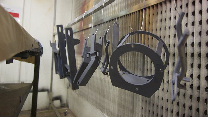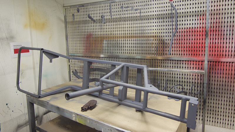 Priming the frame in the spray booth.