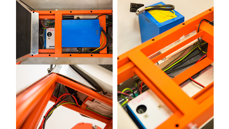 Component test fit: Making sure the controller, battery and solenoid don’t interfere with the steering cables and there’s space for wiring.